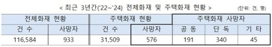 15일 행안부에 따르면 최근 3년간(2022~2024년) 주택에서 발생한 화재는 총 3만1509건이며, 이로 인해 576명이 사망하고 2896명이 연기흡입, 화상 등으로 부상을 입었다.