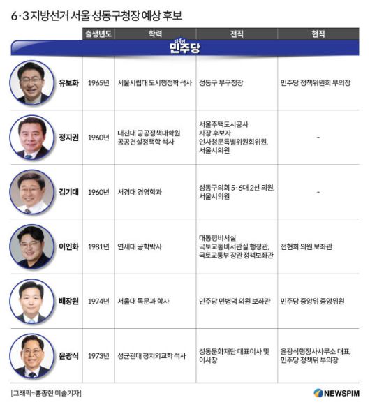 지방선거가 5개월가량 남은 시점에서 정 구청장 뒤를 이을 성동구청장 후보에 관심이 집중되고 있다. 전통적으로 민주당 강세 지역인 만큼 거론되는 민주당 후보자만 6명이다.
