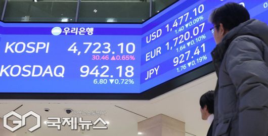 코스피가 사상 첫 4700선을 넘은 14일 서울 중구 우리은행 본점 1층 로비 전광판에 코스피 지수가 표시 돼 있다. 이날 코스피는 전 거래일(4692.64)보다 30.46포인트(0.65%) 상승한 4723.10에, 코스닥 지수는 전 거래일(948.98)보다 6.80포인트(0.72%) 내린 942.18에 거래를 마쳤다.서울 외환시장에서 원·달러 환율은 전 거래일(1473.7원)보다 3.8원 오른 1477.5원에 주간 거래를 마감했다./사진=이용우 기자 |