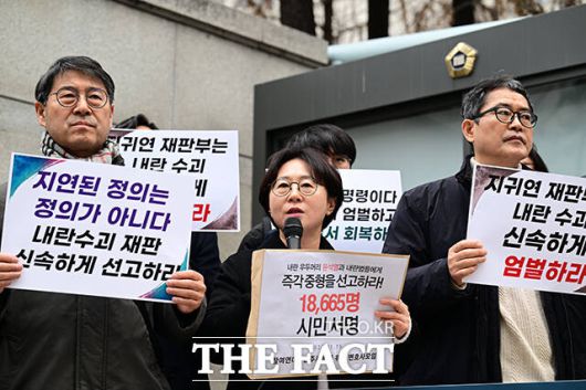 이들은 15일 서울중앙지방법원 앞에서 열린 기자회견에서 "12·3 내란 발생 이후 400여 일이 지나도록 내란 책임자들에 대한 단죄는 지연돼 왔다"며 "지귀연 재판부의 구속취소 결정을 시작으로 피고인 측의 노골적인재판 지연 전략을 사실상 방치한 납득하기 어려운 진행으로 사법부에 대한 국민적 불신을 키웠다"고 지적했다.