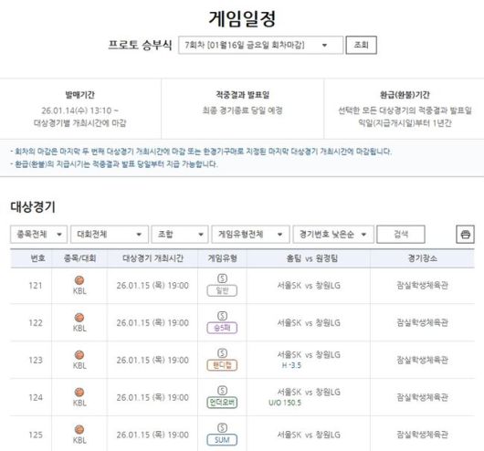2025-2026 KBL 서울SK-창원LG전 대상 프로토 승부식 7회차 게임 마감 앞둬