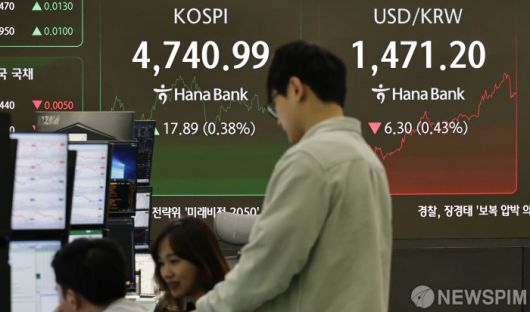 [서울=뉴스핌] 양윤모 기자 = 15일 오후 코스피가 전장 종가보다 17.89 포인트(0.38%) 상승하며 4740.99로, 코스닥은 1.33 포인트(0.14%) 상승한 943.51로 거래되는 가운데, 서울 중구 하나은행 딜링룸에서 직원들이 업무를 보고 있다. 서울외환시장에서 달러/원 환율은 전장 대비 6.30원 하락한 1471.20원에 거래되고 있다. 2026.01.15 yym58@newspim.com