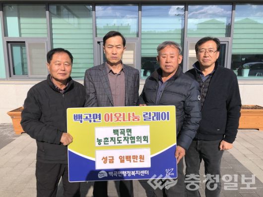 백곡면 농촌지도자연합회(회장 이헌상)도 이날 백곡면 행정복지센터에 이웃 돕기 성금 100만원을 기탁했다.