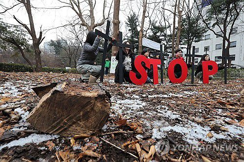 (서울=연합뉴스) 류영석 기자 = 15일 서울 경희궁 내 나무들이 벌목된 '경희궁지 생태 기후 환경숲 조성 사업' 현장에서 환경보건시민센터 회원들이 서울시에 추가 벌목 중단을 촉구하며 퍼포먼스를 하고 있다. 2026.1.15
