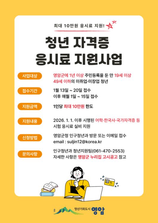 김선미 영암군 인구청년과장은 "청년 자격증 응시료 지원이 취업을 준비하는 청년을 지지하는 힘이 될 수 있도록 하겠다"고 말했다.