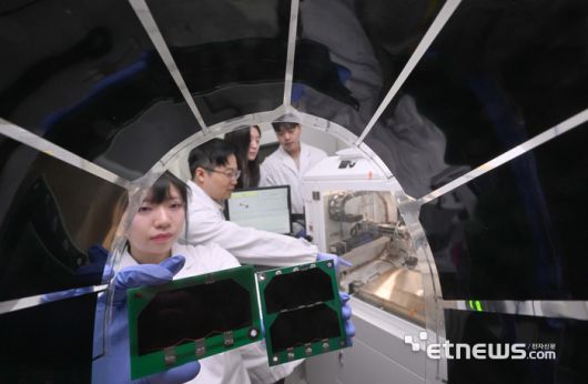 누리호 4차 발사 성공으로 민간 주도의 뉴 스페이스 시대가 열림에 따라 국내 연구진이 극한 환경에서도 운용이 가능한 차세대 고효율 우주항공용 태양광 모듈개발에 박차를 가하고 있다. 22일 경기도 성남시 한국전자기술연구원(KETI) 차세대전지연구센터에서 연구원들이 위성 발사시 부피를 최소화해 전개 가능한 필름기반 초경량·유연 태양광 모듈 기술을 테스트하고 있다. 이 태양광 모듈은 우주방사선 차폐가 가능한 고신뢰성 투명 차폐막 기술을 적용해 앞으로 인공위성 및 고고도 드론용으로 이용될 예정이다. 박지호기자 jihopress@etnews.com |