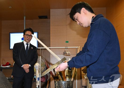 (성남=뉴스1) 박정호 기자 = 문화컨텐츠 현장 방문에 나선 김민석 국무총리가 15일 경기 성남시 넥슨에서 게임 속 효과음 제작 과정을 살펴보고 있다. (공동취재) 2026.1.15/뉴스1