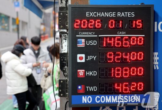 (서울=뉴스1) 이광호 기자 = 15일 오전 서울 중구 명동 환전소 전광판에 환율 시세가 나오고 있다. 연일 고점을 높이며 1480원 선에 근접했던 원·달러 환율은 스콧 베선트 미국 재무장관의 이례적인 구두 개입에 1460원선으로 후퇴했다. 2026.1.15/뉴스1