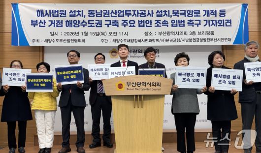 해양수도부산발전협의회는 15일 부산시의회 브리핑룸에서 기자회견을 열고 해사법원 설치, 동남권 투자공사, 북극항로 개척 등 부산 해양수도 관련 법안을 조속히 처리해줄 것을 요구했다. 2026.1.15/뉴스1 ⓒ News1 홍윤 기자 |