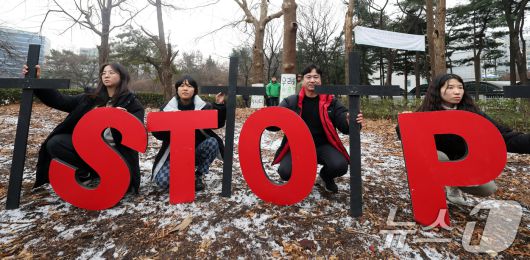 (서울=뉴스1) 황기선 기자 = 환경보건시민센터 회원들이 15일 오전 서울 종로구 경희궁에서 서울시의 경희궁 벌목 규탄 및 추가 벌목 중단을 촉구하는 퍼포먼스를 하고 있다. 2026.1.15/뉴스1