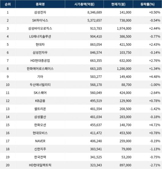 코스피 시가총액 상위 종목들이 전반적으로 엇갈린 흐름을 보였다.