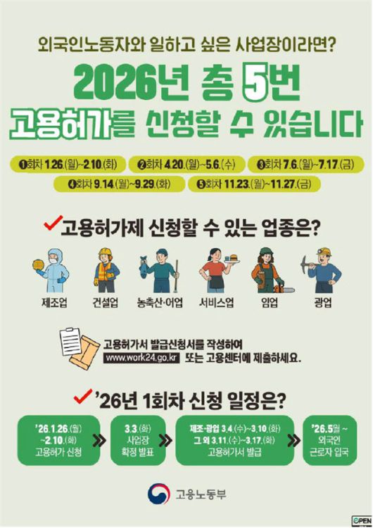 고용노동부는 구인난을 겪는 기업을 지원하기 위해 2026년에도 총 5차례 신규 외국인노동자 고용허가 신청·접수를 진행한다고 15일 밝혔다.