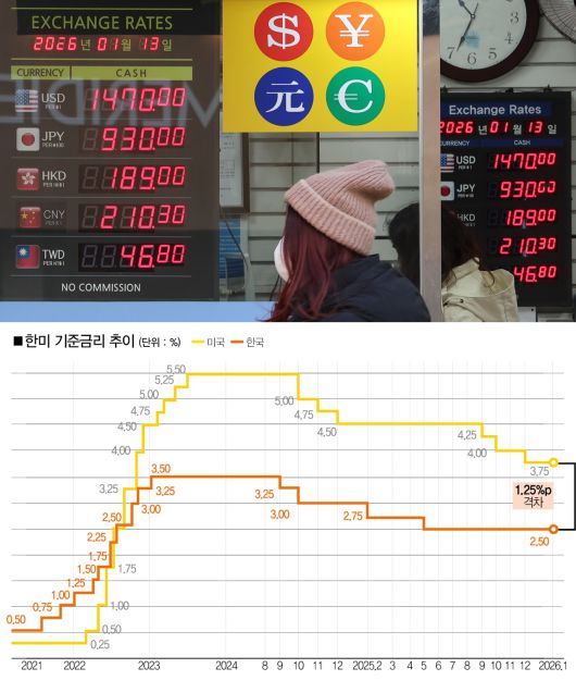 한은이 이번에 금리 동결을 선택한 이유는 또 있다. 미 연방준비제도(연준·Fed)가 금리를 인하할 가능성이 높아졌다는 점이다. 미 시카고상품거래소(CME) 페드워치에 따르면 1월 연준의 기준금리 동결 확률(14일 기준)은 96.1%를 기록했다. 지난해 12월 12일 기록한 75.6%보다 20.5%포인트 상승했다. 한은으로선 원·달러 환율이 상승하고 있는 상황에서 기준금리를 인하해 한미 금리차를 벌릴 필요가 없다고 계산했을 수 있다. 현재 미국의 기준금리는 4.0%(상단 기준)로, 한미 금리 차이는 1.25%포인트다.