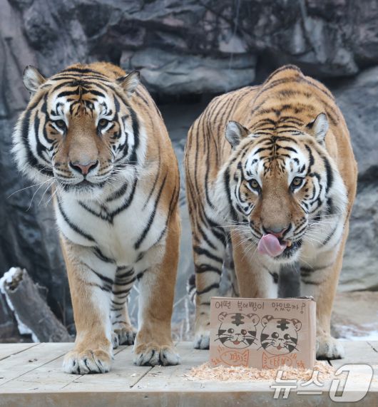 (용인=뉴스1) 김영운 기자 = 15일 경기 용인시 처인구 에버랜드 타이거 밸리에서 한국 호랑이 다운이와 나라가 인리치먼트(행동풍부화) 활동을 하고 있다. 2026.1.15/뉴스1