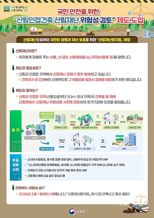 해당 제도가 정착되면 건축 설계 단계부터 산림재난 위험성을 고려해 예방시설을 마련할 수 있어 산림재난에 선제적으로 대비하고 국민의 생명과 신체를 보호하는 데 크게 기여할 것으로 기대하고 있습니다.