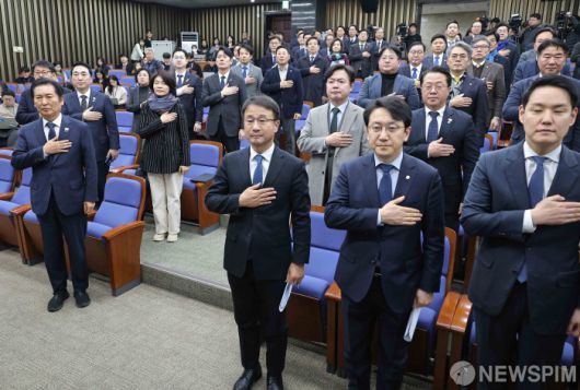 [서울=뉴스핌] 윤창빈 기자 = 정청래 더불어민주당 대표, 한병도 원내대표 등 소속 의원들이 15일 서울 여의도 국회에서 열린 의원총회에서 국민의례를 하고 있다. 2026.01.15 pangbin@newspim.com