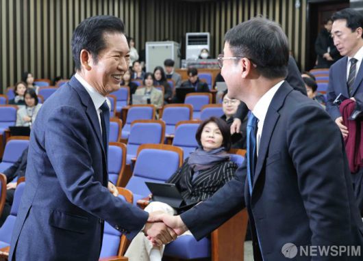 [서울=뉴스핌] 윤창빈 기자 = 정청래 더불어민주당 대표, 한병도 원내대표가 15일 서울 여의도 국회에서 열린 의원총회에서 악수를 하고 있다. 2026.01.15 pangbin@newspim.com