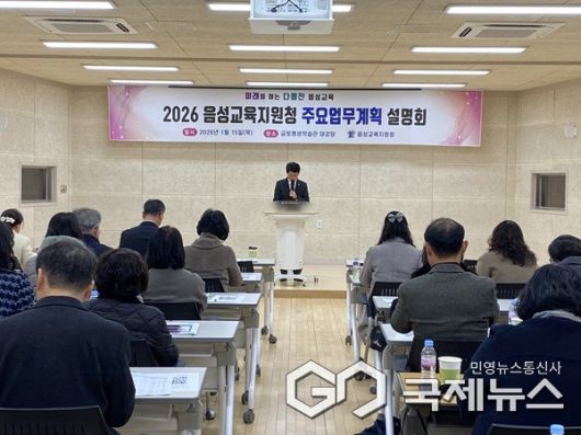 (음성=국제뉴스) 이재기 기자 = 충북 음성교육지원청(교육장 안병권)은 1월 15일 금빛평생학습관 대강당에서 관내 유·초·중·고·특수·각종학교 교(원)장 43명을 대상으로 2026년 주요업무계획 설명회를 개최했다.