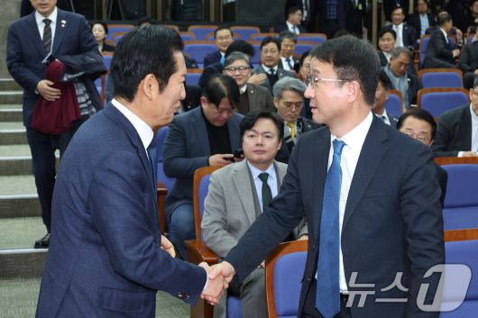 (서울=뉴스1) 신웅수 기자 = 정청래 더불어민주당 대표와 한병도 원내대표가 15일 서울 여의도 국회에서 열린 의원총회에서 인사하고 있다. 2026.1.15/뉴스1phonalist@news1.krCopyright ⓒ 뉴스1. All rights reserved. 무단 전재 및 재배포, AI학습 이용 금지.