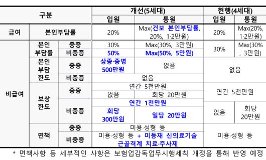 비중증 비급여 입원비의 경우 본인부담률을 현행 30%에서 50%로 상향한다. 중증 비급여의 연간 보상 한도는 5000만원, 비중증 비급여는 1000만원으로 설정되며, 면책 사항 등 세부 기준은 보험업감독업무시행세칙 개정을 통해 반영될 예정이다.