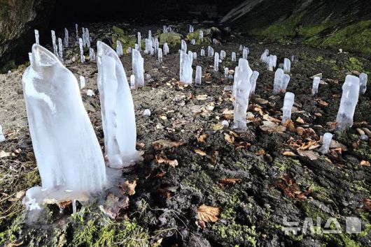 최근 맹추위가 이어지면서 동굴 안에는 땅바닥에서 위로 솟은 역고드름들이 줄지어 서 있다. 석굴 천장에서 떨어지는 물이 얼어붙으면서 생기는 이 고드름은 마치 월악산을 딛고 선 듯한 모습이다.