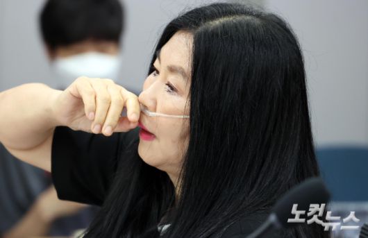 '가습기살균제 피해자단체 대표 간담회' 에 참석한 가습기살균제 중등도 피해자 민수연 씨가 의료용 산소호흡용 줄을 만지고 있다. 황진환 기자 |