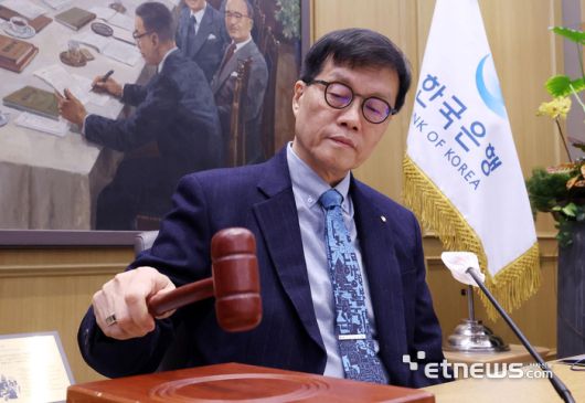이창용 한국은행 총재가 15일 오전 서울 중구 한국은행에서 열린 금융통화위원회 본회의를 주재하며 의사봉을 두드리고 있다. 이날 한은 금통위는 연 2.50%인 기준금리를 유지하기로 결정했다. 5연속 동결 결정이다. 이동근기자 foto@etnews.com [Copyright © 전자신문. 무단전재-재배포금지]