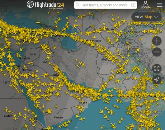 전 세계 여객기 이동 상황을 보여주는 사이트인 플라이트레이더24 15일 갈무리. 오전 7시 이후 운항이 재개됐지만 이란 영공을 지나는 항공편의 수는 많지 않다. 플라이트레이더24 갈무리. |