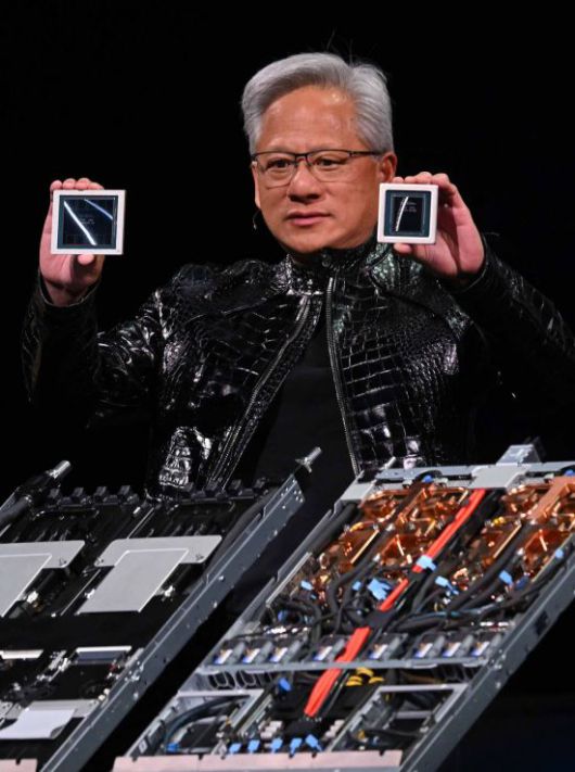 젠슨 황 엔비디아 CEO가 5일(현지시간) 미국 네바다주 라스베이거스 퐁텐블로 호텔에서 열린 엔비디아 CES 2026 라이브에서 차세대 그래픽처리장치(GPU)루빈 GPU를 선보이고 있다. 연합뉴스 |