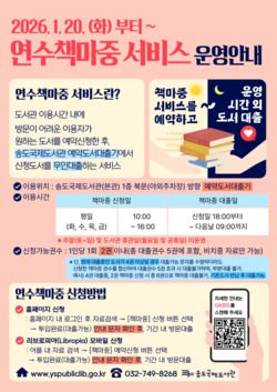'연수책마중 서비스'는 송도국제도서관 1층 북문(야외주차장) 방향에 설치된 예약도서 대출기기를 통해 제공되며, 이용자는 1인당 1회 최대 2권까지 신청할 수 있다. 서비스 신청은 매주 평일(화~금요일까지) 오전 10시부터 오후 4시까지 '연수구립도서관' 누리집과 모바일 앱 '리브로피아'으로 하면 된다.