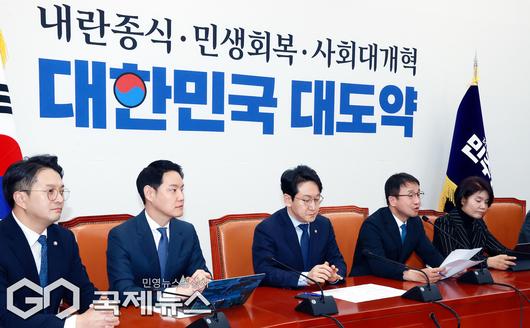 (서울=국제뉴스) 한병도 더불어민주당 원내대표가 15일 서울 여의도 국회에서 열린 정책조정회의에서 모두 발언을 하고 있다./사진=이용우 기자