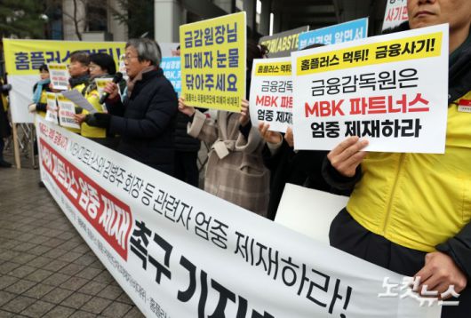홈플러스 대주주인 MBK파트너스의 김병주 회장 등 경영진에 대한 구속영장이 모두 기각된 가운데 15일 서울 여의도 금융감독원 앞에서 ‘MBK파트너스 엄중 제재 촉구’ 기자회견이 열리고 있다.진실은 노컷, 거짓은 칼컷저작권자 © CBS 노컷뉴스 무단전재 및 재배포 금지
