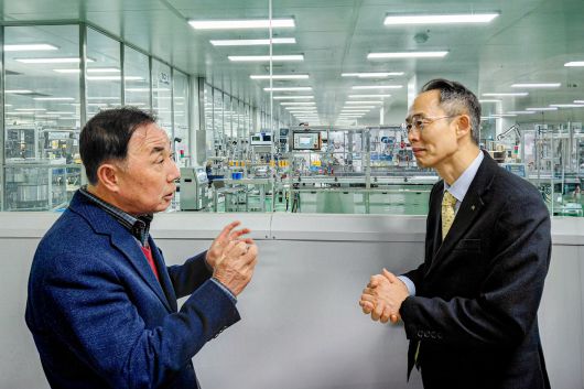 황기연(오른쪽) 한국수출입은행장이 15일 충북 음성에 있는 코스메카코리아 본사를 찾아 지재성 코스메카코리아 부회장과 대화하고 있다. [수은 제공] |