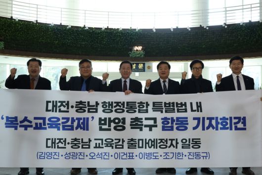 대전·충남 교육감 출마 예정자들이 지난 13일 대전시의회에서 기자회견을 열고 “행정통합 출범 시 교육 분야만큼은 복수 교육감제로 운영돼야 한다”고 촉구하고 있다. [연합뉴스] |