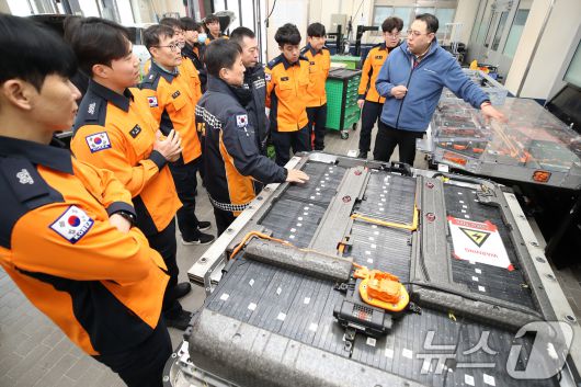 (대구=뉴스1) 공정식 기자 = 15일 대구 남구 영남이공대 스마트 e-자동차과 실습실에서 열린 '대구소방안전본부 전기자동차 화재진압 역량 강화 교육'에 참가한 소방관들이 전기차를 살펴보며 구동장치와 배터리 구조 등에 대한 설명을 듣고 있다. 대구소방안전본부는 2023년 영남이공대교와 업무협약을 맺고, 화재조사 및 화재진압 대원들의 전기자동차 화재진압 대응 능력 강화 교육을 진행하고 있다. 2026.1.15/뉴스1