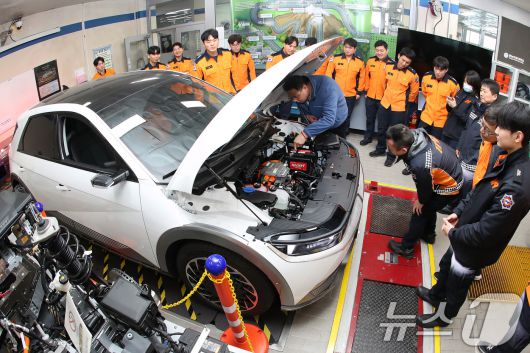 (대구=뉴스1) 공정식 기자 = 15일 대구 남구 영남이공대 스마트 e-자동차과 실습실에서 열린 '대구소방안전본부 전기자동차 화재진압 역량 강화 교육'에 참가한 소방관들이 전기차를 살펴보며 구동장치와 배터리 구조 등에 대한 설명을 듣고 있다. 대구소방안전본부는 2023년 영남이공대교와 업무협약을 맺고, 화재조사 및 화재진압 대원들의 전기자동차 화재진압 대응 능력 강화 교육을 진행하고 있다. 2026.1.15/뉴스1