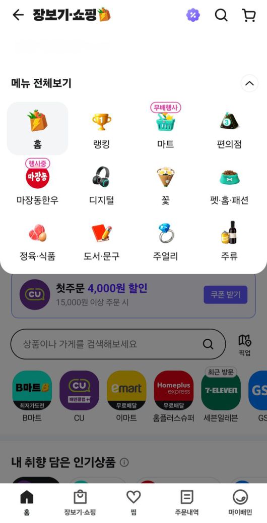 배민앱의 장보기·쇼핑홈 카테고리는 마트, 편의점, 디지털, 꽃, 펫·홈·패션, 정육·식품, 도서·문구, 주얼리 등이 운영되고 있다.