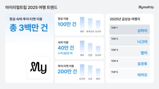 마이리얼트립에 따르면 2025년 항공·숙박·투어·티켓 서비스를 통해 발생한 여행 이용 건수는 총 300만 건을 넘어섰다. 이 가운데 항공권 예약은 약 100만 건으로 집계됐다. 항공 이용 상위 목적지는 △제주 △후쿠오카 △오사카 △도쿄 △부산 순으로, 접근성과 재방문 수요가 높은 지역이 중심을 이뤘다.