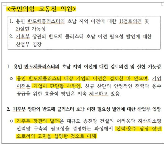 고 의원에 따르면 산업부는 용인 반도체 클러스터의 안정적인 전력·용수 공급을 위한 효율적 방안을 지속적으로 점검하고 있다고 보고했다. 또 호남 이전에 대한 기후부 장관의 발언은 대규모 송전망 건설의 어려움과 지산지소형 전력망 구축의 필요성을 설명하는 과정에서 전력·용수 담당 장관으로서의 고민을 설명한 것으로 이해하고 있다고 답변했다.