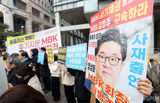 [서울=뉴스핌] 정일구 기자 = 홈플러스사태해결 공동대책위원회·홈플러스 물품구매전단채피해자 비상대책위원회·금융정의연대 관계자들이 15일 오후 서울 영등포구 금융감독원 앞에서 홈플러스 사태 MBK파트너스 엄중 제재 촉구 기자회견을 하고 있다. 2026.01.15 mironj19@newspim.com