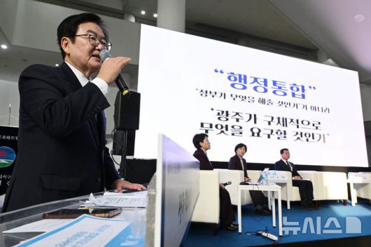 [광주=뉴시스] 이영주 기자 = 문인 광주 북구청장이 13일 오전 광주 서구 광주시의회에서 열린 새로운광주포럼의 토론회 '광주·전남 행정통합 시도민과 함께 길을 묻다'에 참여해 발표하고 있다. 2026.01.13. leeyj2578@newsis.com |