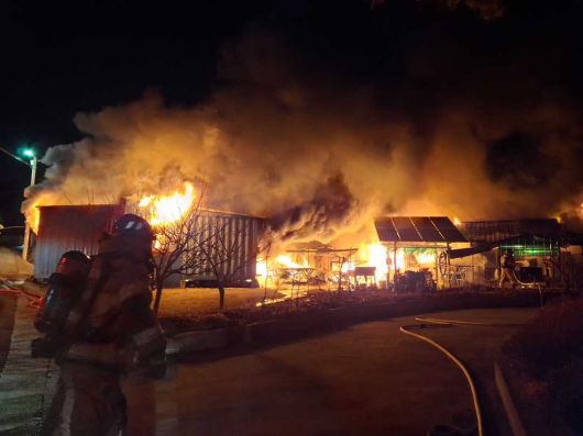 15일 오전 1시 35분 강원 삼척시 우지동의 단독주택에서 불이 나 소방대원이 진화작업을 벌이고 있다. 강원특별자치도소방본부 제공 |
