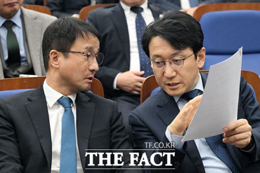 [더팩트ㅣ국회=남용희 기자] 한병도 더불어민주당 원내대표(왼쪽)와 천준호 원내운영수석부대표가 15일 오후 서울 여의도 국회에서 열린 의원총회에서 대화를 나누고 있다.
