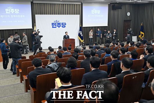 [더팩트ㅣ국회=남용희 기자] 정청래 더불어민주당 대표가 15일 오후 서울 여의도 국회에서 열린 의원총회에서 발언을 하고 있다.