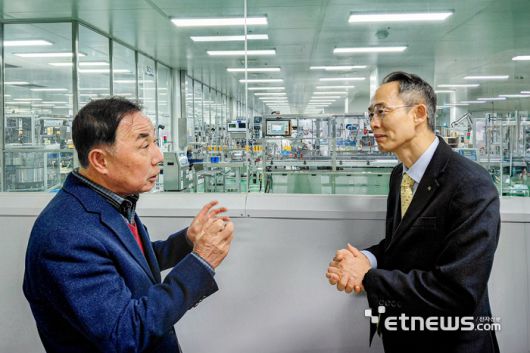 황기연 한국수출입은행장(오른쪽)이 15일 충북 음성에 위치한 코스메카코리아 본사를 방문해 지재성 코스메카코리아 부회장과 대화 중이다. |