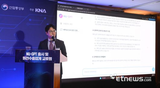 NU-GPT 출시 및 원전수출업계 교류회가 산업통상부 주최로 15일 서울 중구 롯데호텔에서 열렸다. 이덕형 한국원전수출산업협회 차장이 NU-GPT를 시연하고 있다.