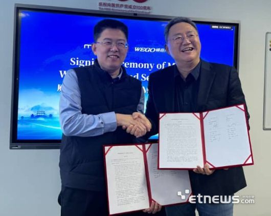 (오른쪽부터)김준연 메코비 대표와 피터 장 위고 그룹 해외사업 부문국장 |