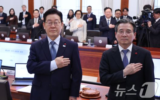 이재명 대통령이 15일 청와대에서 열린 수석보좌관회의에서 국민의례를 하고 있다. 2026.1.15/뉴스1 ⓒ News1 이재명 기자 |
