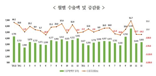 창원세관이 15일 발표한 ‘2025년 12월 및 연간 경남지역 수출입 현황’에 따르면 12월 경남 수출은 전년 동월 대비 14.2% 감소한 38억5000만 달러를 기록했다.