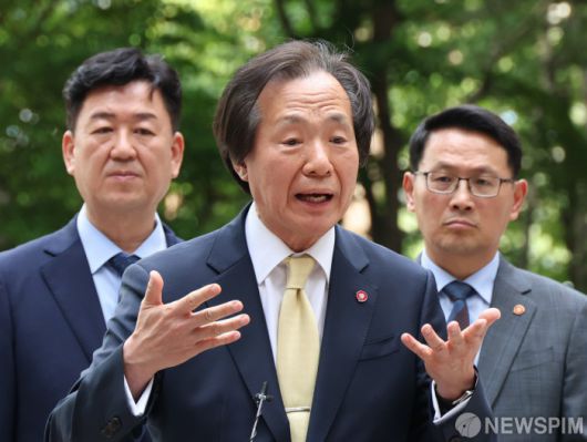 [서울=뉴스핌] 이호형 기자 = 정기석 국민건강보험공단 이사장이 22일 오후 서울 서초구 고등법원서 열린 담배회사 KT&G,한국필립모리스,BAT코리아 상대 '500억대 담배 손해배상청구소송' 항소심 12차 변론기일 출석에 앞서 열린 기자회견서 입장을 밝히고 있다. 2025.05.22 leemario@newspim.com |